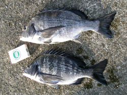 渡船屋さんの情報では 「クロダイはだいぶ型が小さくなってるけどアイナメは大きいのがポツポツ出だしたよ」 とのことです。このポツポツってのが悩ましい。堤防に渡ってみると前打ち組はひとりも見かけませんでした。その代わり、アイナメの探り組の方々を多く見受けました。当方も前打ち竿でアイナメとクロダイの両刀使いで、アイナメとクロダイを一枚ずつゲット。